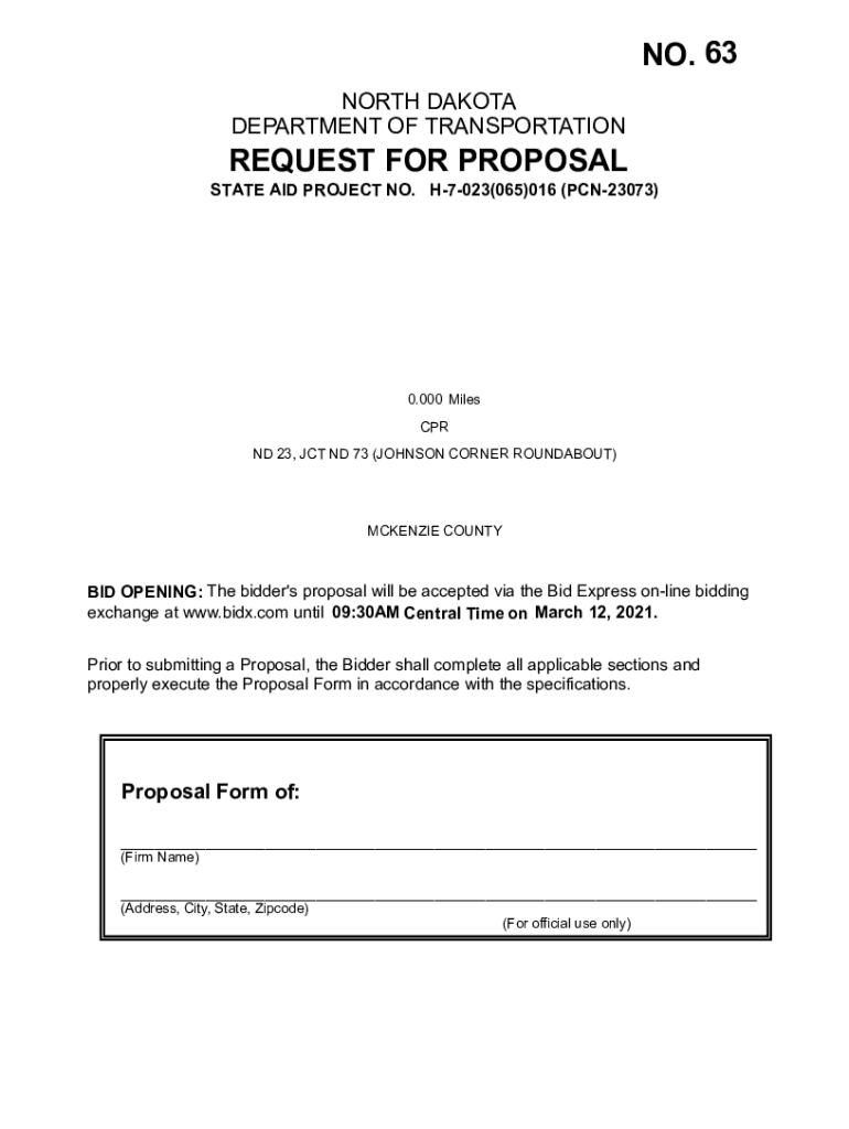 NO. 63 NORTH DAKOTA DEPARTMENT OF TRANSPORTATIONREQUEST FOR PROPOSAL STATE AID PROJECT NO. H7023(065)016 (PCN23073)0.000 Miles CPR ND 23, JCT ND 73 (JOHNSON CORNER ROUNDABOUT)McKenzie COUNTY BID OPENING: