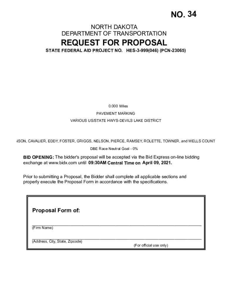 NO. 34 NORTH DAKOTA DEPARTMENT OF TRANSPORTATIONREQUEST FOR PROPOSAL STATE FEDERAL AID PROJECT NO. HES3999(046) (PCN23065)0.000 Miles PAVEMENT MARKING VARIOUS US/STATE HWYSDEVILS LAKE DISTRICTS, CAVALIER,