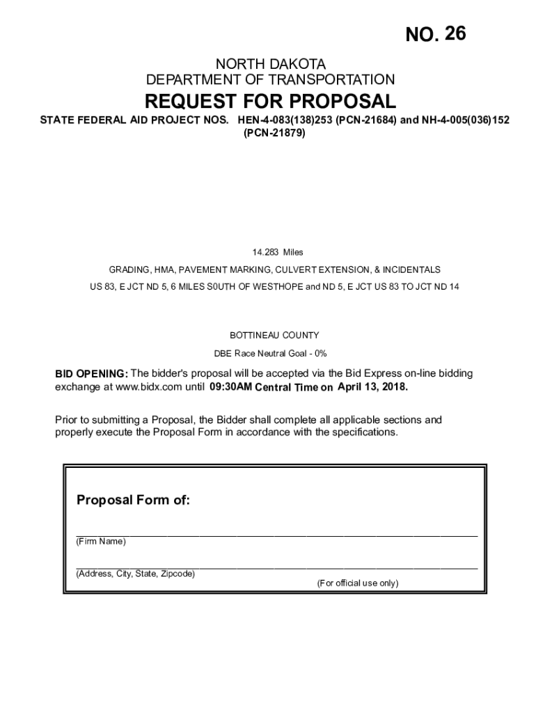NO. 26 NORTH DAKOTA DEPARTMENT OF TRANSPORTATIONREQUEST FOR PROPOSAL STATE FEDERAL AID PROJECT NOS. HEN4083(138)253 (PCN21684) and NH4005(036)152 (PCN21879)14.283 Miles GRADING, MA, PAVEMENT MARKING,