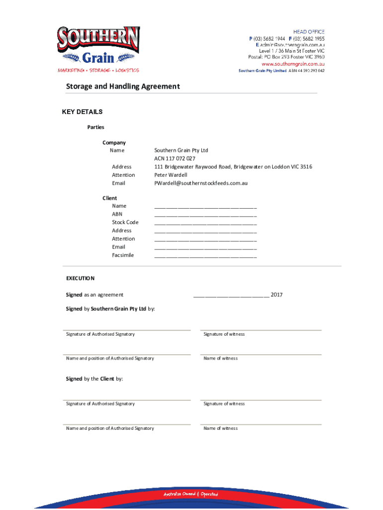 Storage and Handling Agreement KEY DETAILS Parties Company Name Address Attention Email Client Name ABN Stock Code Address Attention Email FacsimileSouthern Grain Pty Ltd ACN 117 072 027 111 Bridgewater