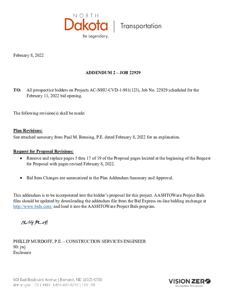 February 8, 2022ADDENDUM 2 JOB 22929TO:All prospective bidders on Projects ACNHUCVD1981(123), Job No. 22929 scheduled for the February 11, 2022, bid opening. The following revision(s) shall be made:Plan