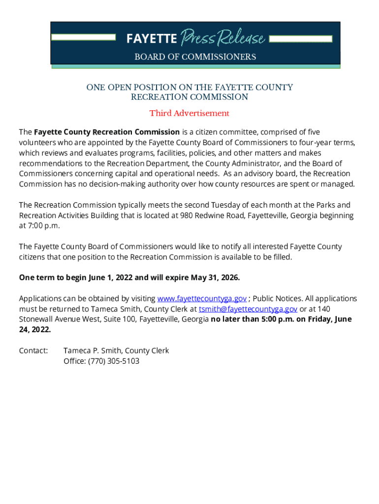 FAYETTE BOARD OF COMMISSIONERS ONE OPEN POSITION ON THE FAYETTE COUNTY RECREATION COMMISSION Third Advertisement The Fayette County Recreation Commission is a citizen committee, comprised of five