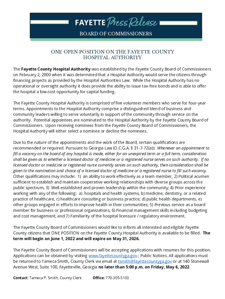 FAYETTE BOARD OF COMMISSIONERS ONE OPEN POSITION ON THE FAYETTE COUNTY HOSPITAL AUTHORITY The Fayette County Hospital Authority was established by the Fayette County Board of Commissioners on February