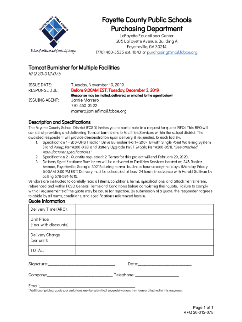 Fayette County Public Schools Purchasing DepartmentLaFayette Educational Center 205 Lafayette Avenue, Building A Fayetteville, GA 30214 (770) 4603535 ext. 1043 or purchasing@mail.fcboe.org Tomcat