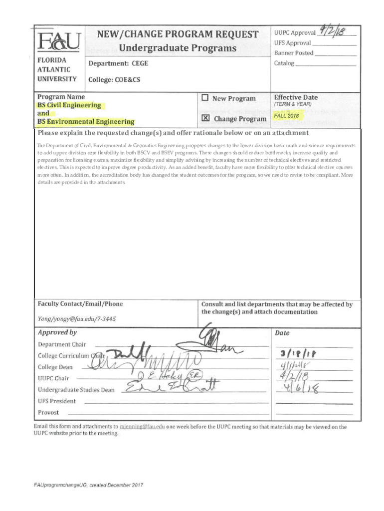 NEW/CHANGE PROGRAM REQUEST Undergraduate Programs FLORIDA ATLANTIC UNIVERSITYUUPC Approval ___ UFS Approval ___ Banner Posted ___ Catalog ___Department: CAGE College: COE&CSProgram Name BS Civil Engineering