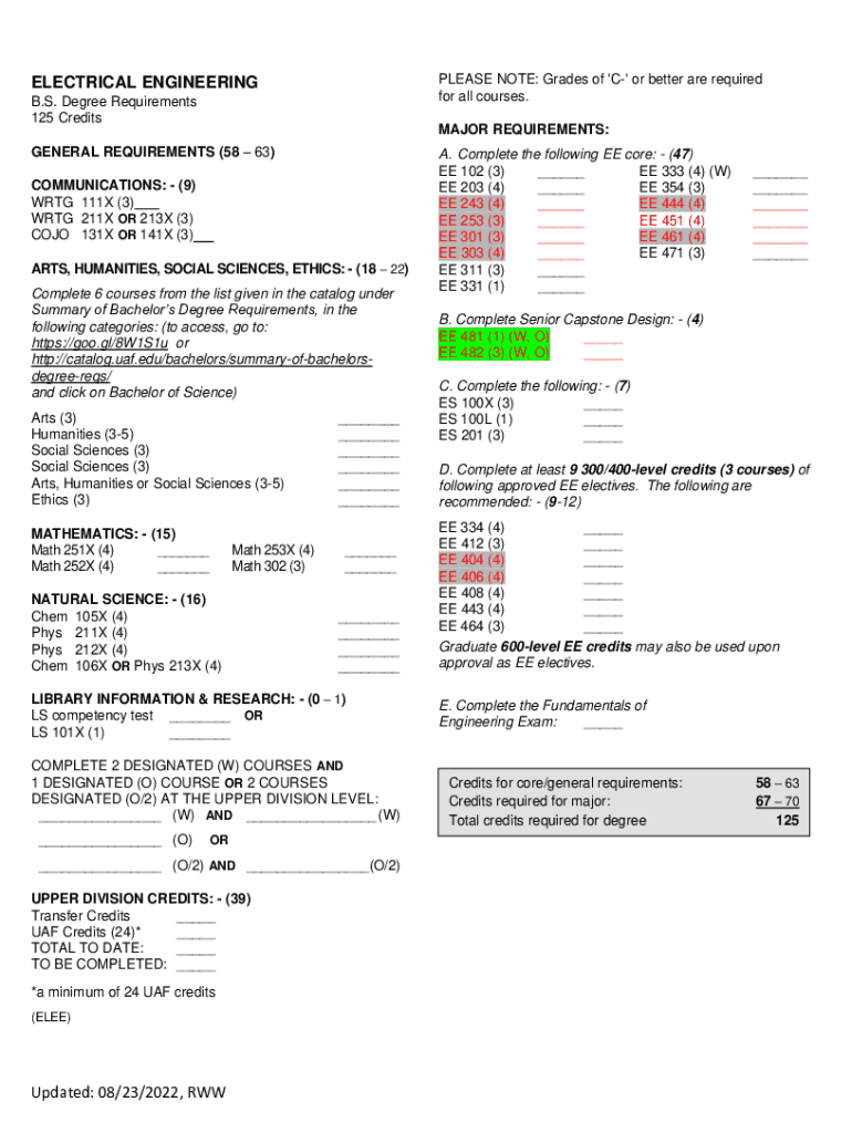 PLEASE NOTE: Grades of \'C\' or better are required for all courses. ELECTRICAL ENGINEERING B.S. Degree Requirements 125 CreditsMAJOR REQUIREMENTS:GENERAL REQUIREMENTS (58 63) COMMUNICATIONS: (9)