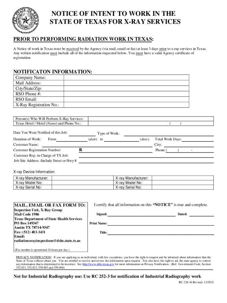 NOTICE OF INTENT TO WORK IN THE STATE OF TEXAS FOR RAY SERVICES PRIOR TO PERFORMING RADIATION WORK IN TEXAS: A Notice of work in Texas must be received by the Agency (via mail, email or fax) at least