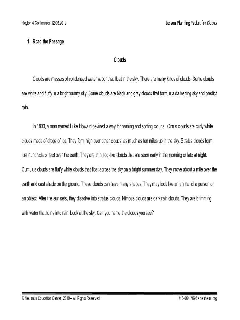 Lesson Planning Packet for CloudsRegion 4 Conference 12.05.20191. Read the Passage Clouds are masses of condensed water vapor that float in the sky. There are many kinds of clouds. Some clouds are
