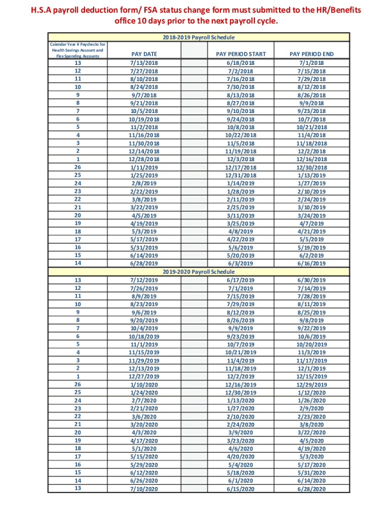 H.S.A payroll deduction form/ FSA status change form must submit to the HR/Benefits office 10 days prior to the next payroll cycle. Calendar Year # Paychecks for Health Savings Account and Flex Spending
