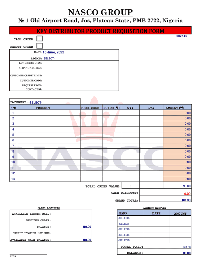 PASCO GROUP 1 Old Airport Road, Jo's, Plateau State, PMB 2722, Nigeria DISTRIBUTOR PRODUCT REQUISITION FORM002545CASH ORDER: CREDIT ORDER: DATE: 15 June 2022 REGION: SELECTED DISTRIBUTOR: SHIPPING