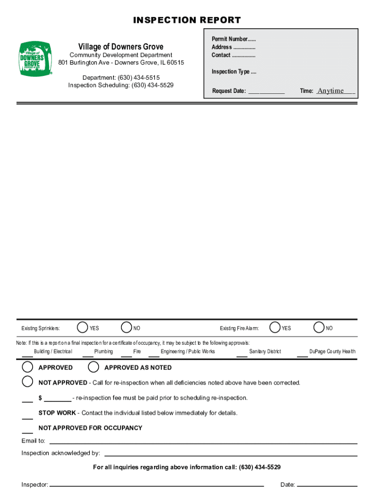 Fill out the inspection report form accurately and completely, providing detailed descriptions and documentation where necessary.