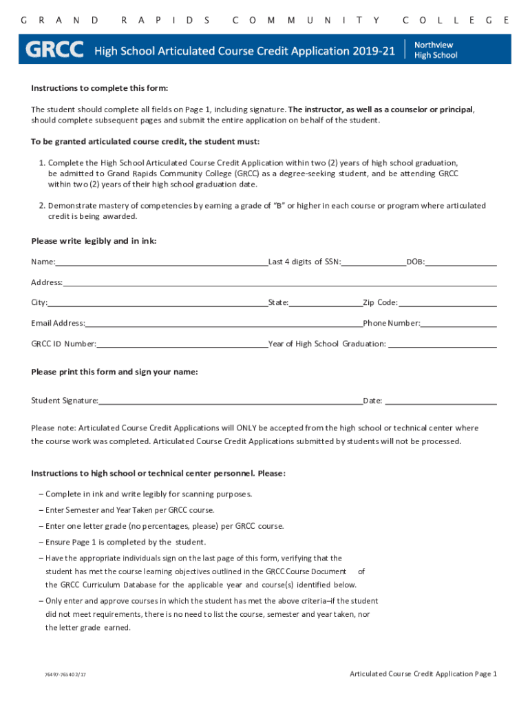 GRANDRAPIDSCOMMUNITYCOLLEGInstructions to complete this form: The student should complete all fields on Page 1, including signature. The instructor, as well as a counselor or principal, should complete