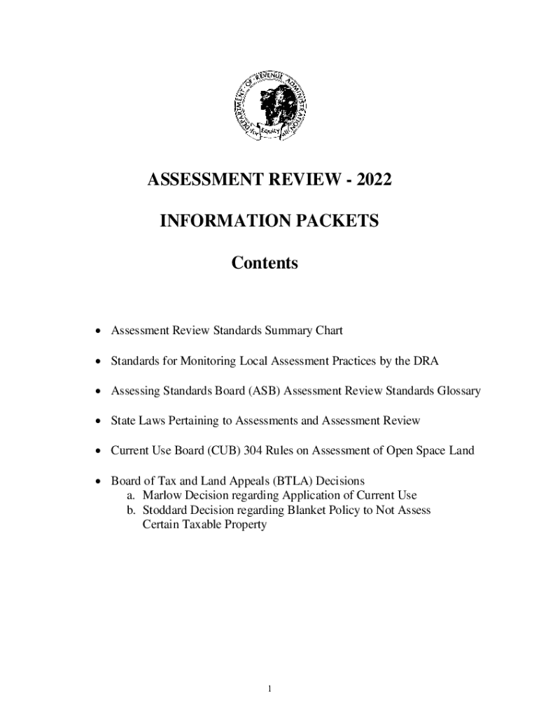 ASSESSMENT REVIEW 2022 INFORMATION PACKETS Contents Assessment Review Standards Summary Chart Standards for Monitoring Local Assessment Practices by the DRA Assessing Standards Board (ASB) Assessment
