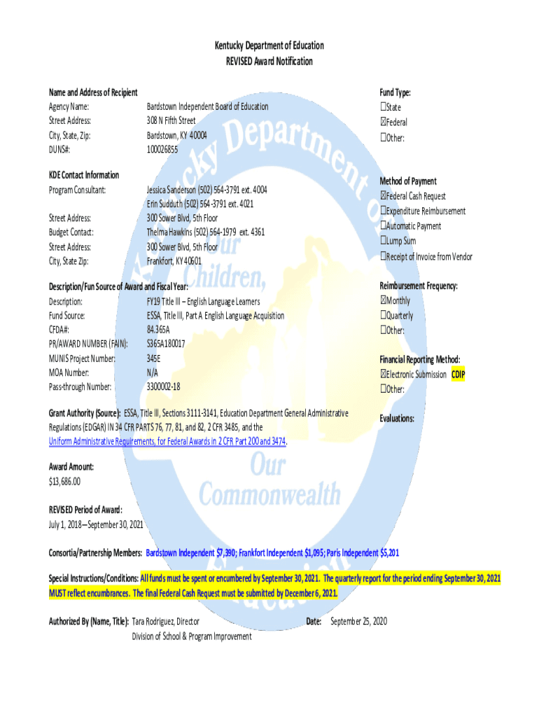 Kentucky Department of Education REVISED Award Notification Name and Address of Recipient Agency Name: Street Address: City, State, Zip: DUNS#: KBE Contact Information Program Consultant: Street Address: