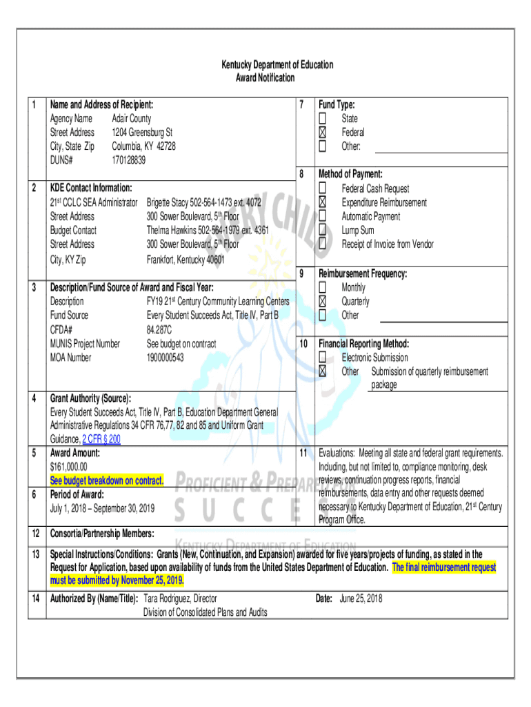 Kentucky Department of Education Award Notification 1Name and Address of Recipient: Agency Name Aware County Street Address 1204 Greensburg St City, State Zip Columbia, KY 42728 DUNS# 1701288392KDE