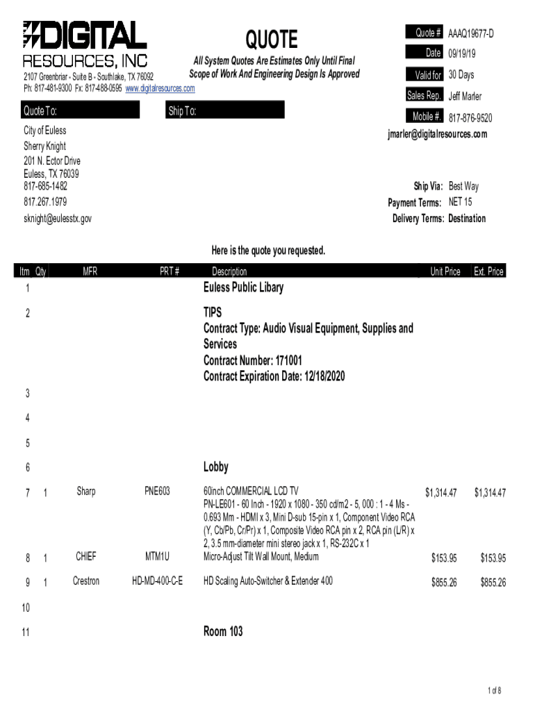 QUOTEQuote #All System Quotes Are Estimates Only Until Final Scope of Work And Engineering Design Is Approved2107 Greenbrier Suite B South lake, TX 76092 pH: 8174819300 FX: 8174880595 www.digitalresources.comQuote