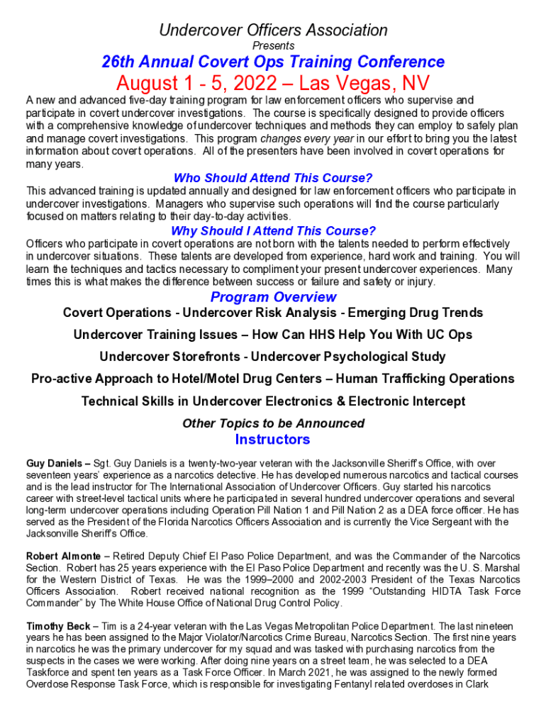 Undercover Officers Association Presents26th Annual Covert Ops Training Conference August 1 5, 2022 Las Vegas, NV A new and advanced five-day training program for law enforcement officers who supervise