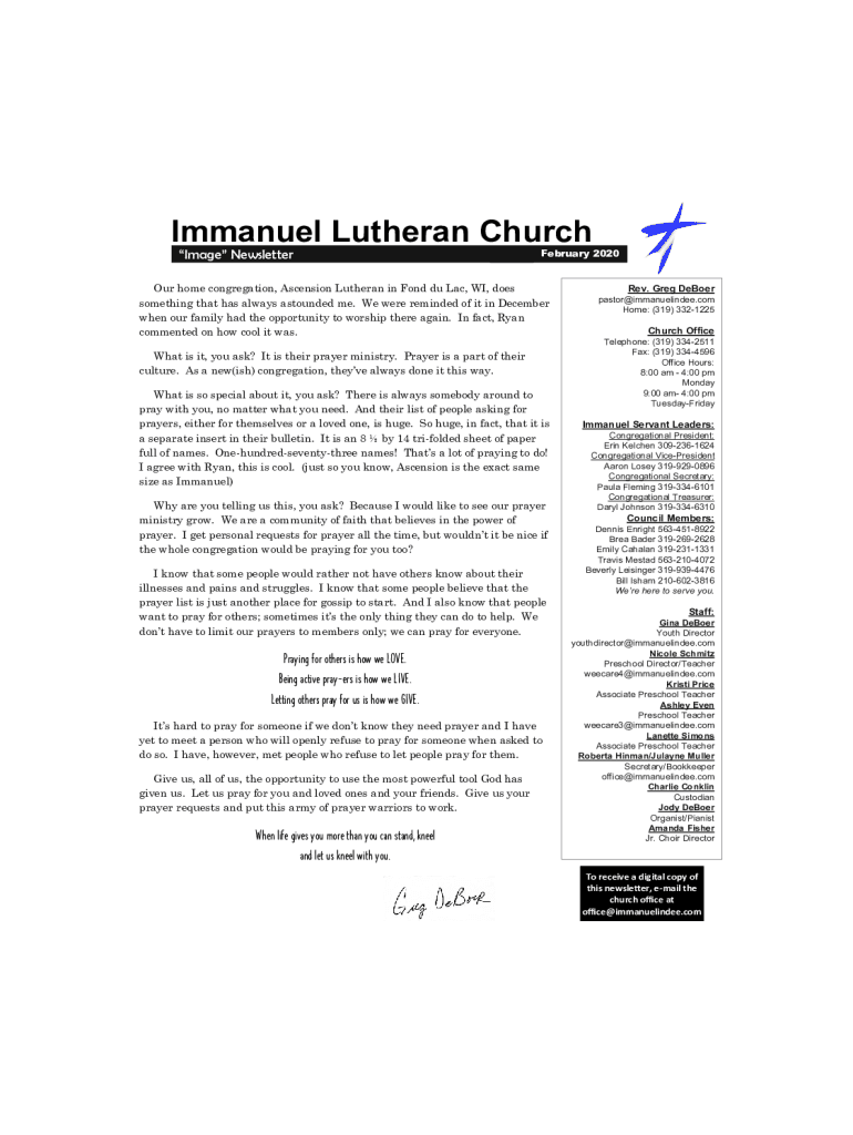 Immanuel Lutheran Church 1February 2020Image Newsletter home congregation, Ascension Lutheran in Fond du Lac, WI, does something that has always astounded me. We were reminded of it in December when