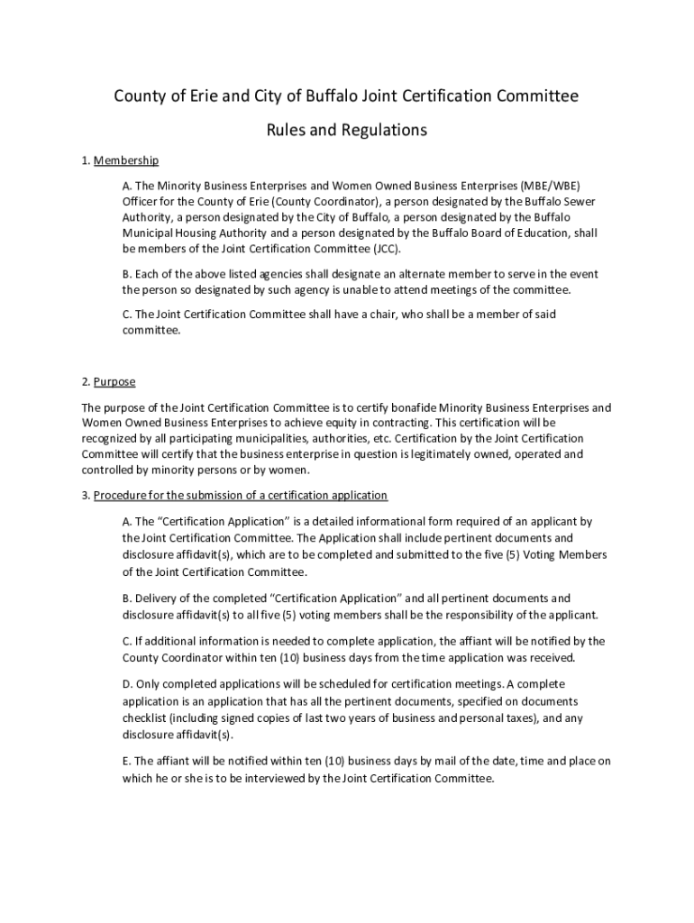 County of Erie and City of Buffalo Joint Certification Committee Rules and Regulations 1. Membership A. The Minority Business Enterprises and Women Owned Business Enterprises (BE/WE) Officer for the