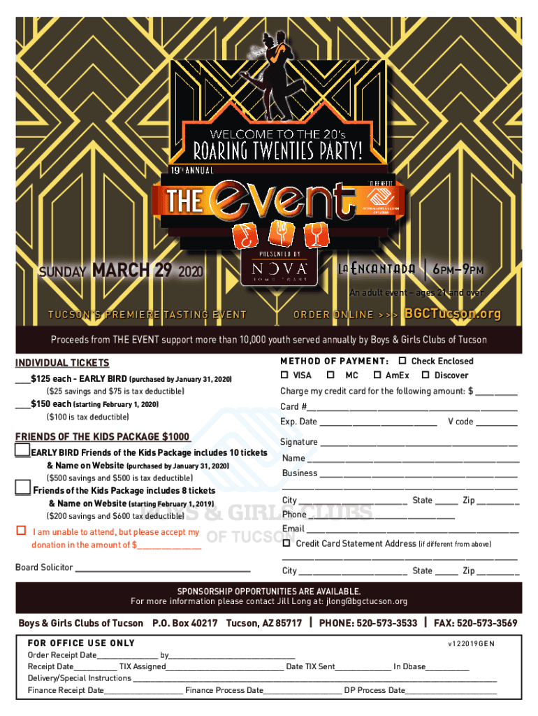 An adult event ages 21 and overt U C S O N S P R E M I E R E TA S T I N G E V E NT ORDER ONLINE BGC Tucson. Proceeds from THE EVENT support more than 10,000 youth served