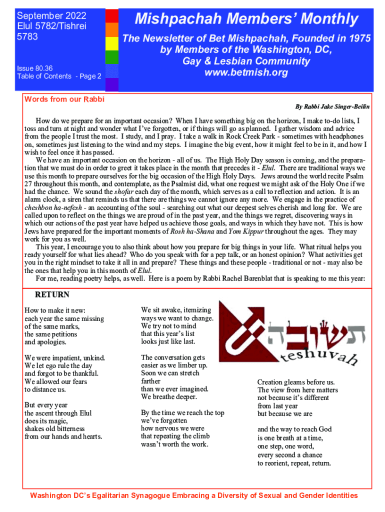 September 2022 Mishpachah Members Monthly Elul 5782/Tishri 5783 Issue 80.36 Table of Contents Page 2Page Mishpachah Members Monthly Elul 5782Tishrei 5783/September 2022The Newsletter of Bet Mishpachah,
