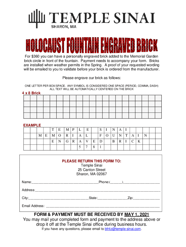 For $360 you can have a personally engraved brick added to the Memorial Garden brick circle in front of the fountain. Payment needs to accompany your form. Bricks are installed when weather permits