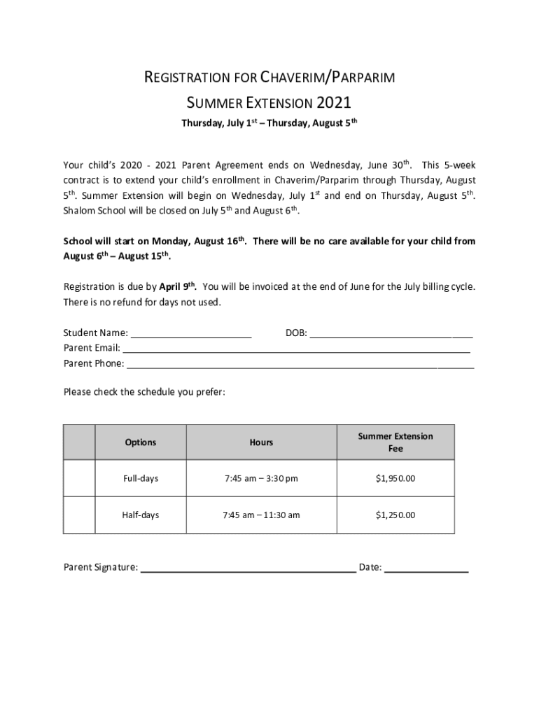 REGISTRATION FOR CHARM/PARADIGM SUMMER EXTENSION 2021 Thursday, July 1st Thursday, August 5thYour children 2020 2021 Parent Agreement ends on Wednesday, June 30th. This 5week contract is to extend