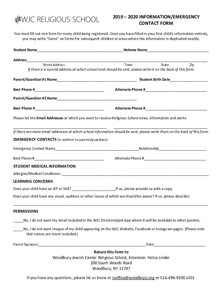 2019 2020 INFORMATION/EMERGENCY CONTACT FORM You must fill out one form for every child being registered. Once you have filled in your first children information entirely, you may write Same on forms
