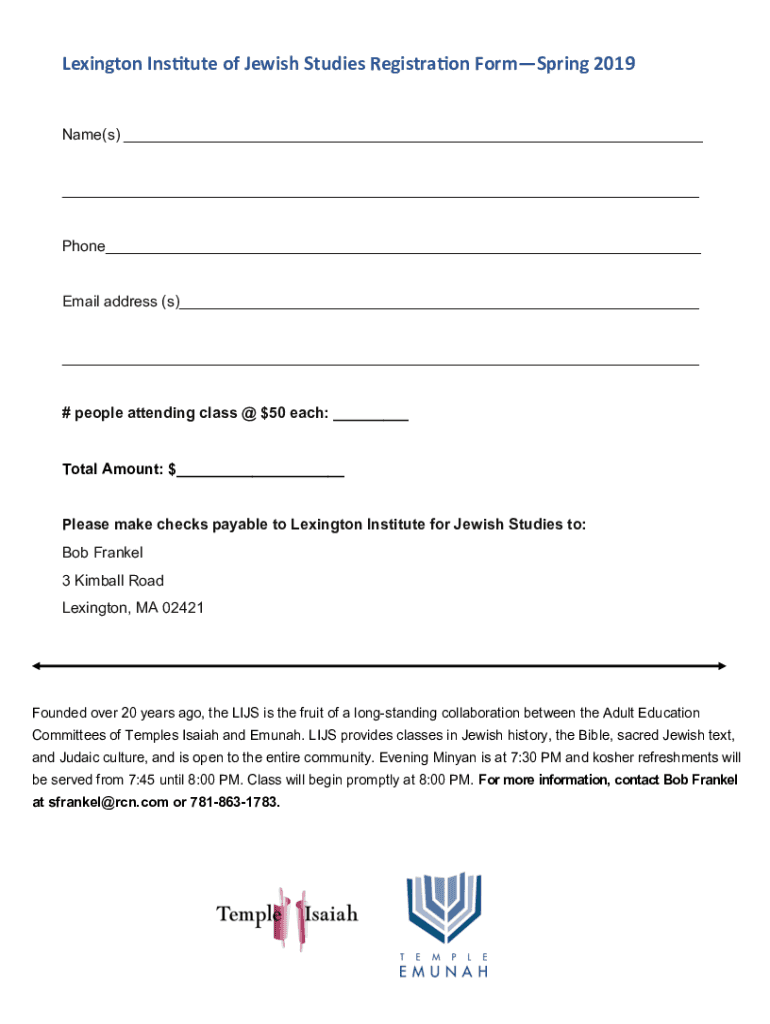 Lexington Institute of Jewish Studies Registration Forming 2019 Name(s) ___ ___ Phone___ Email address (s)___ ___ # people attending class @ $50 each: ___ Total Amount: $___ Please make checks payable