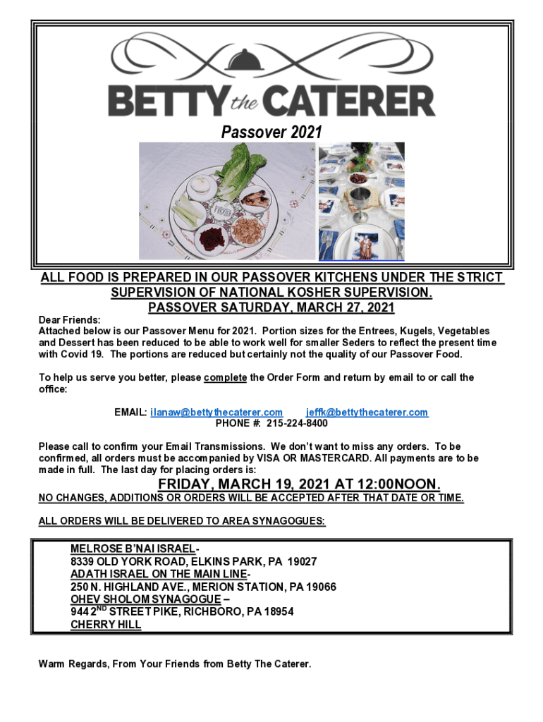 Passover 2021ALL FOOD IS PREPARED IN OUR PASSOVER KITCHENS UNDER THE STRICT SUPERVISION OF NATIONAL KOSHER SUPERVISION. PASSOVER SATURDAY, MARCH 27, 2021, Dear Friends: Attached below is our Passover