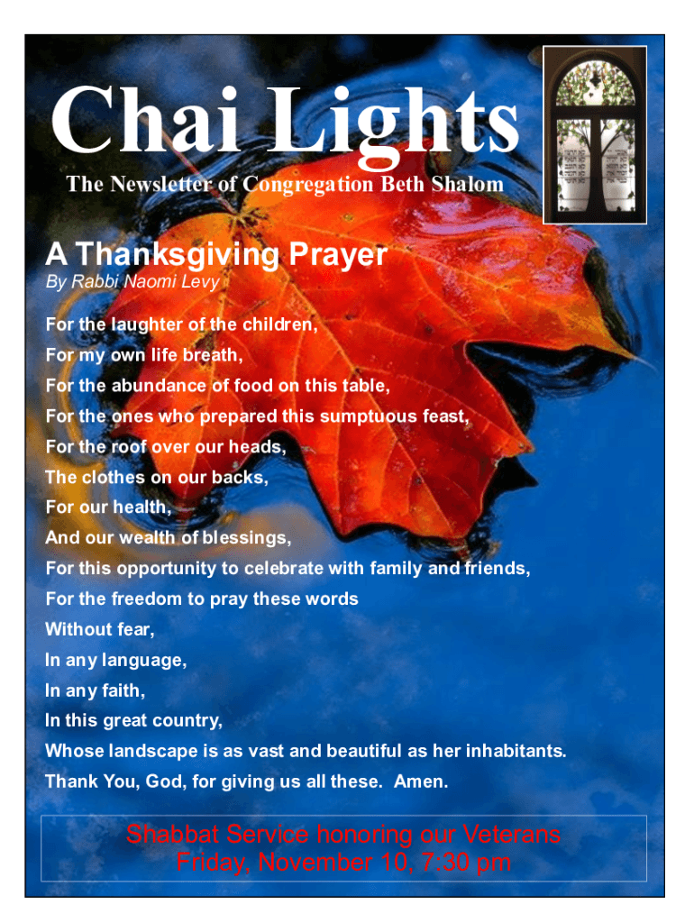 Chai Lights The Newsletter of Congregation Beth Shalom Thanksgiving Prayer By Rabbi Naomi Elevator the laughter of the children, For my own life breath, For the abundance of food on this table, For