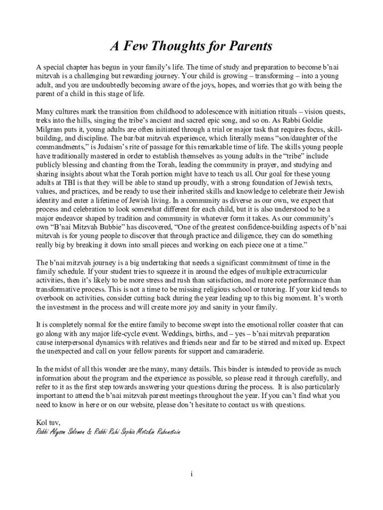 A Few Thoughts for Parents A special chapter has begun in your families life. The time of study and preparation to become bani mitzvah is a challenging but rewarding journey. Your child is growing