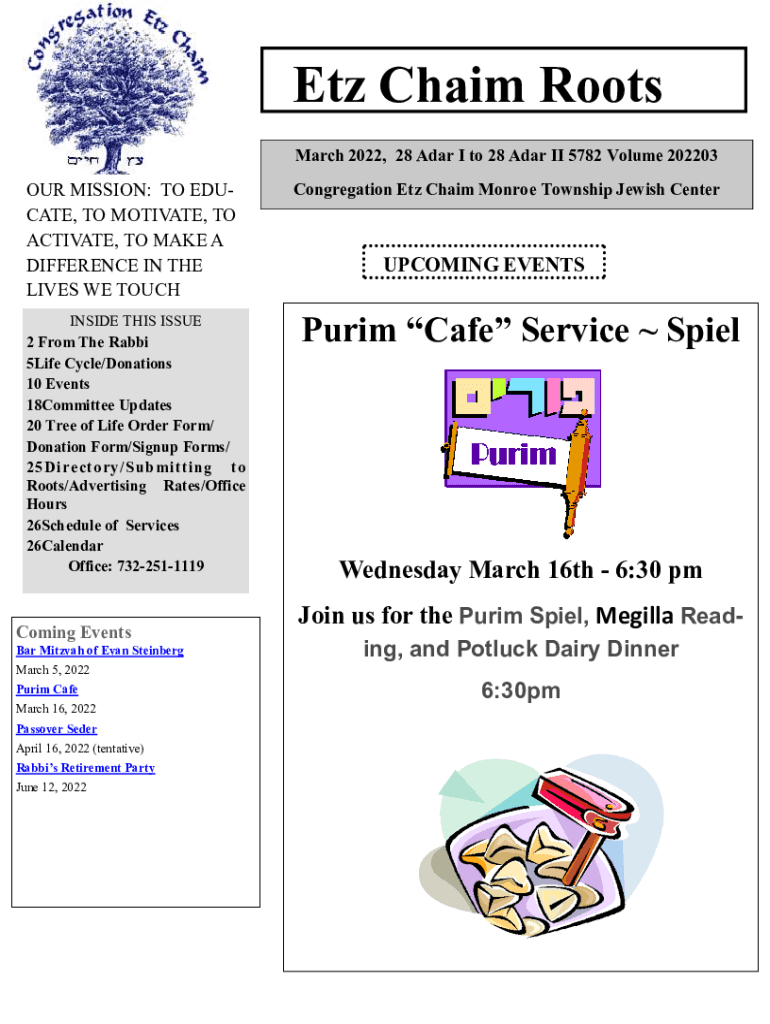ETZ Chief Roots March 2022, 28 Adar I to 28 Adar II 5782 Volume 202203OUR MISSION: TO EDUCATE, TO MOTIVATE, TO ACTIVATE, TO MAKE A DIFFERENCE IN THE LIVES WE TOUCH INSIDE THIS ISSUE 2 From The Rabbi