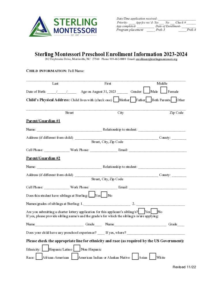 Date/Time application received ___Priority ___ App fee recd Yes ___ No ___ Check # ___App completed ___ Date of Enrollment ___Program placement ___ Prek3___Prek4Sterling Montessori Preschool Enrollment