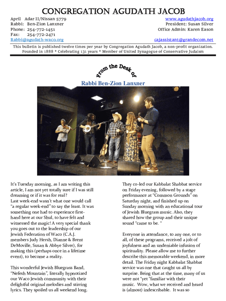 Congregation Audit Jacob April Adar II/Nissan 5779 Rabbi: Ben Zion Manner Phone: 2547721451 Fax: 2547722471 Rabbi@agudathwaco.orgwww.agudathjacob.org President: Susan Silver Office Admin: Karen Season
