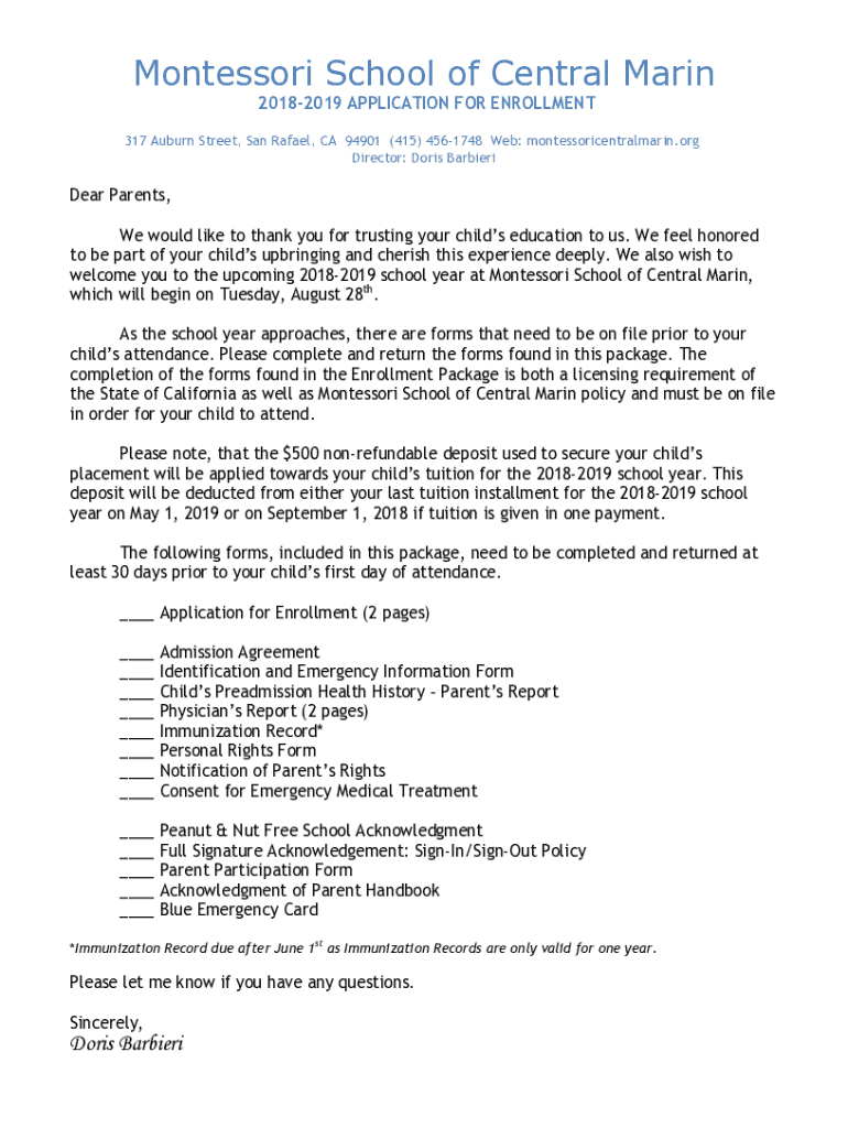 Montessori School of Central Marin 20182019 APPLICATION FOR ENROLLMENT 317 Auburn Street, San Rafael, CA 94901 (415) 4561748 Web: montessoricentralmarin.org Director: Doris Barbarities Parents, We