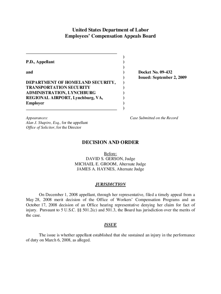 United States Department of Labor Employees Compensation Appeals Board ___ P.D., Appellant and DEPARTMENT OF HOMELAND SECURITY, TRANSPORTATION SECURITY ADMINISTRATION, LYNCHBURG REGIONAL AIRPORT,