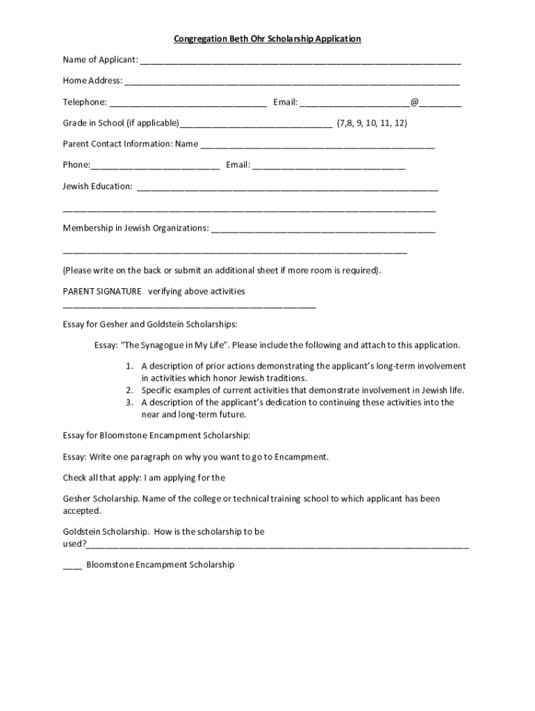 Congregation Beth Or Scholarship Application Name of Applicant: ___ Home Address: ___ Telephone: ___ Email: ___@___ Grade in School (if applicable)___ (7,8, 9, 10, 11, 12) Parent Contact Information: