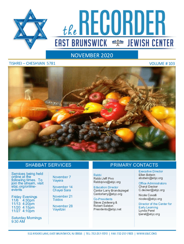 NOVEMBER 2020 TISHRI HESHVAN 5781SHABBAT SERVICES being held online at the following times. To join the stream, visit ebjc.org/onlineevents Friday Evenings 11/6 4:30pm 11/13 4:20pm 11/20 4:15pm 11/27