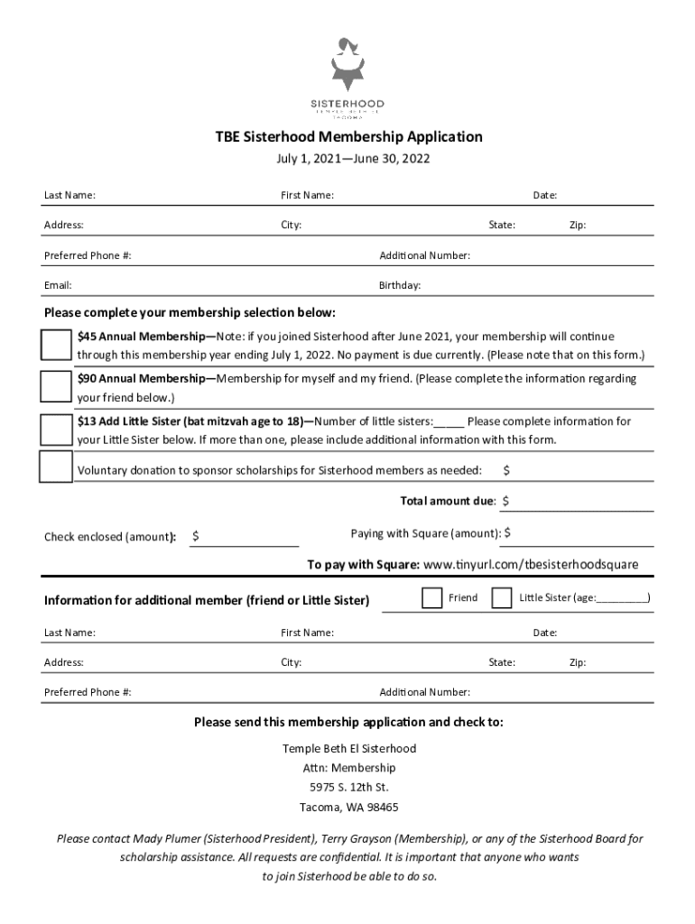 THE Sisterhood Membership Application July 1, 2021June 30, 2022 Last Name:First Name:Address:City:Date: State:Preferred Phone #:Additional Number:Email:Birthday:Zip:Please complete your membership