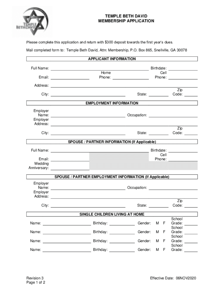 TEMPLE BETH DAVID MEMBERSHIP APPLICATIONPlease complete this application and return with $300 deposit towards the first years dues. Mail completed form to: Temple Beth David, Attn: Membership, P.O.