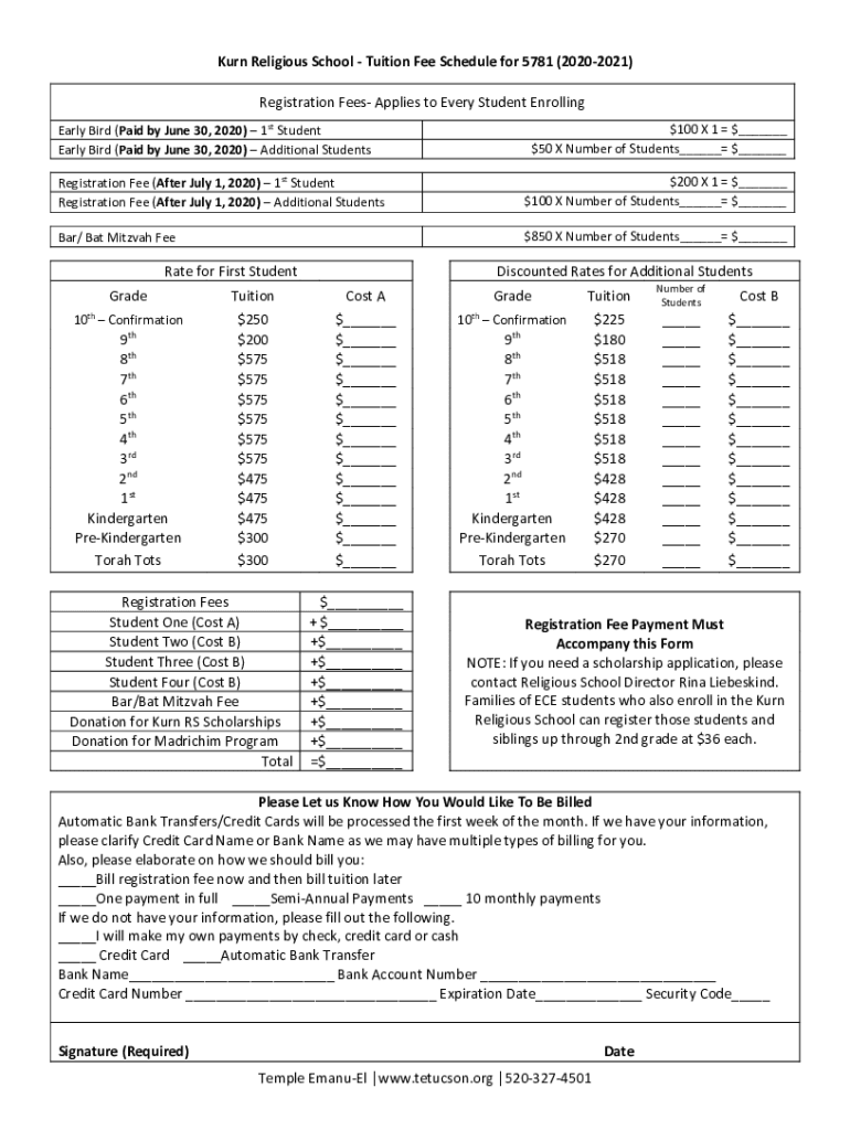 Turn Religious School Tuition Fee Schedules for 5781 (20202021) Registration Fees Applies to Every Student Enrolling Early Bird (Paid by June 30, 2020) 1st Student Early Bird (Paid by June 30, 2020)
