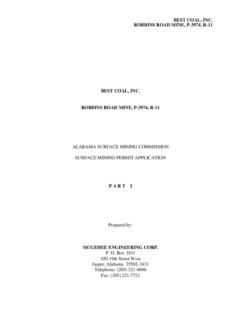 BEST COAL, INC. ROBBINS ROAD MINE, P3974, R11BEST COAL, INC.ROBBINS ROAD MINE, P3974, R11ALABAMA SURFACE MINING COMMISSION SURFACE MINING PERMIT APPLICATIONPARTIPrepared by:McGhee ENGINEERING CORP.