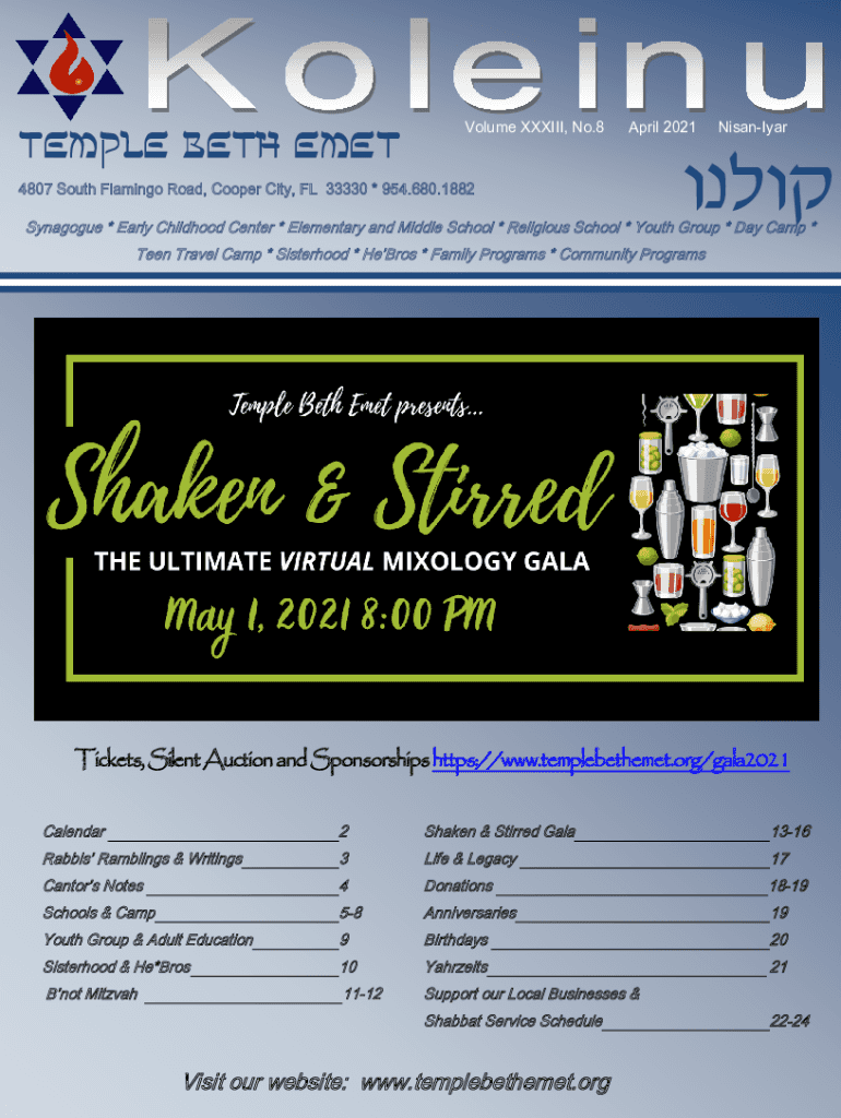 Temple Beth EmetVolume XXXIII, No.8April 20214807 South Flamingo Road, Cooper City, FL 33330 × 954.680.1882NisanIyarSynagogue * Early Childhood Center * Elementary and Middle School * Religious School