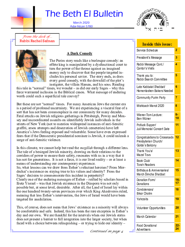 The Beth El Bulletin March 2020 Adar Nisan 5780From the desk rabbi Rachel SafmanInside this issue: A Dark Comedy Purim story reads like a burlesque comedy: an effete king is manipulated by a dysfunctional