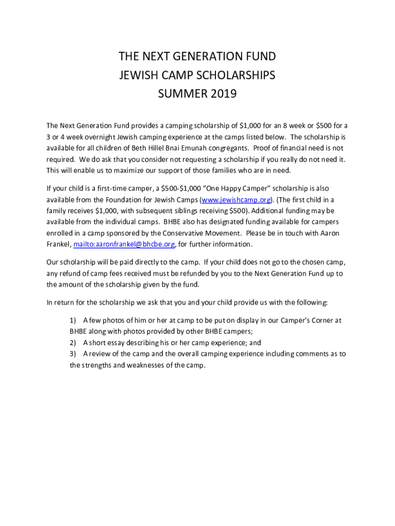 THE NEXT GENERATION FUND JEWISH CAMP SCHOLARSHIPS SUMMER 2019 The Next Generation Fund provides a camping scholarship of $1,000 for an 8 week or $500 for a 3 or 4 week overnight Jewish camping experience
