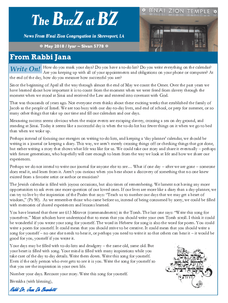 The Buzz at BY News From Bani Zion Congregation in Shreveport, From Rabbi Jana How do you mark your days? Do you have a to-do list? Do you write everything on the calendar? Are you keeping up with