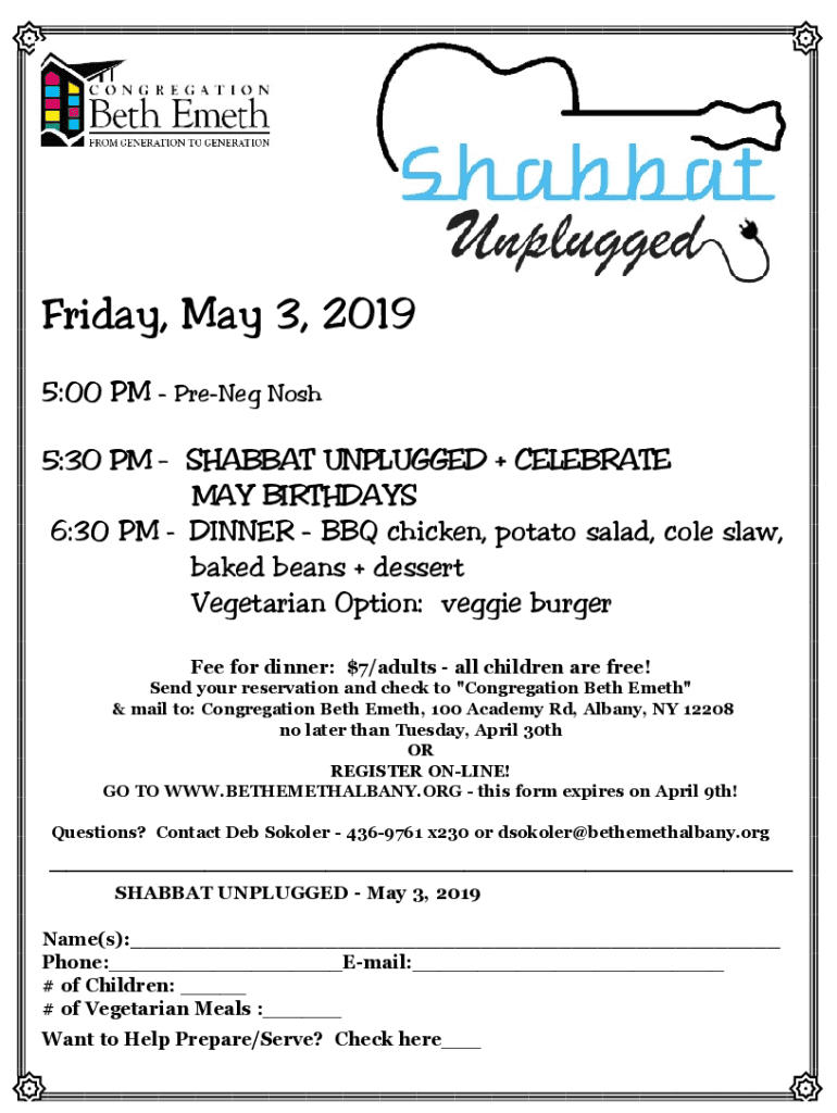 Friday, May 3, 2019 5:00 PM Prefer Nosh 5:30 PM SHABBAT UNPLUGGED + CELEBRATE MAY BIRTHDAYS 6:30 PM DINNER BBQ chicken, potato salad, coleslaw, baked beans + dessert Vegetarian Option: veggie burger
