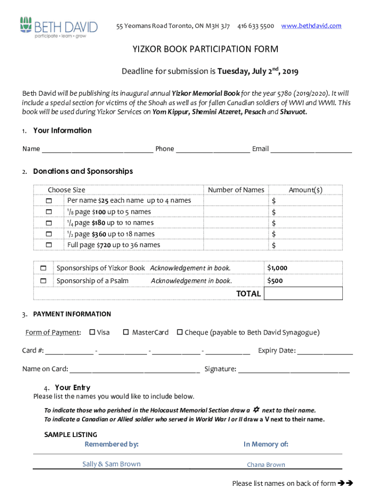 55 Yeoman Road Toronto, ON M3H 3J7416 633 5500www.behaved.comYIZKOR BOOK PARTICIPATION FORM