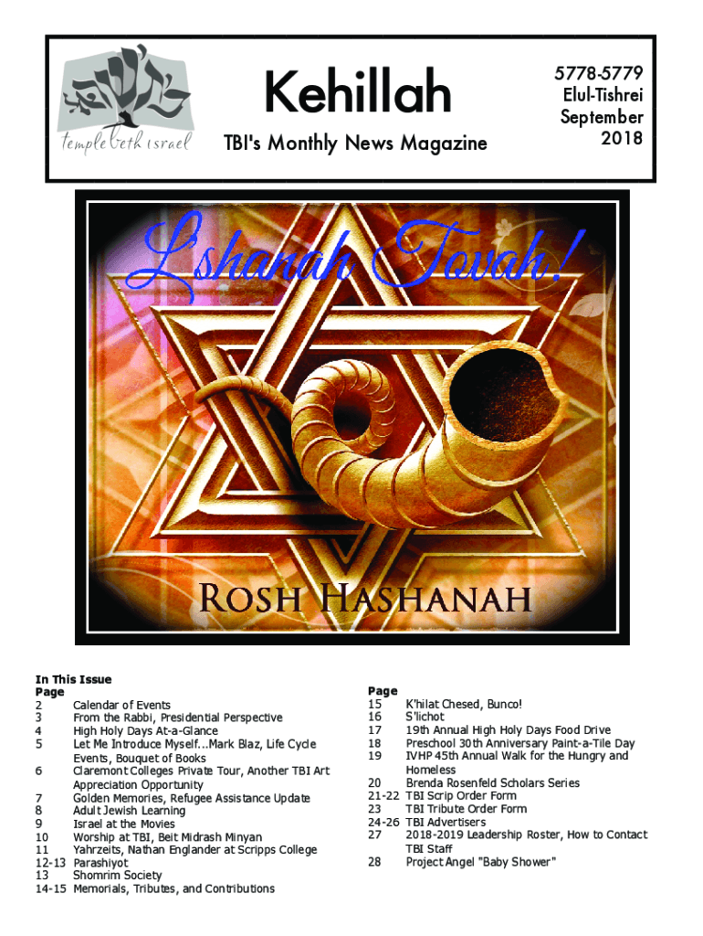 Delilah TBI\'s Monthly News Magazine57785779 ElulTishrei September 2018In This Issue Page 2 Calendar of Events 3 From the Rabbi, Presidential Perspective 4 High Holy Days Balance 5 Let Me Introduce